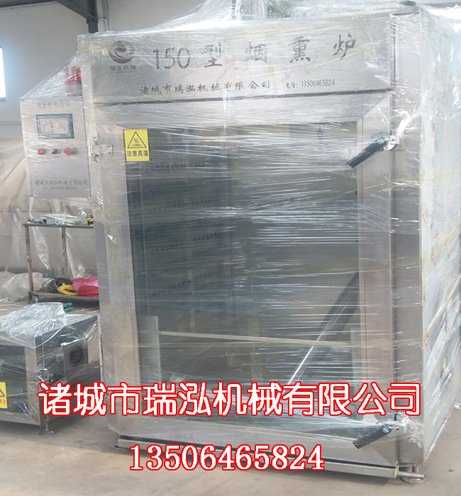 烟熏炉主要是由炉体、控制箱、发烟室三部分组成。炉体采用304部锈钢制作而成,是进行烟熏上色蒸煮烘干的场所,上部有风扇、铜盘管,风扇的作用是在电机的带动将吸上来的热气、烟雾进行扩散,达到均匀地效果,风力循环越好,烟熏效果越好,产品品质越好。铜盘管是用于烘干功能时,蒸汽通过蒸汽预留口进入铜盘管内,铜导热性好,传热速度快,并且增大了接触空间,升温速度更快,高效节能。电加热管在两侧,升温速度快,受热均匀。两个温度探头,一个测炉内温度一个测食品温度,可以随时观察炉内温湿度。对炉内的温度进行工艺的控制,外观的帮助我们判断产品的熟化状态。炉内两侧有独立烟道,上部设有排气口、排烟口,侧面专门有蒸汽对流口,目的也是保证炉内温度、烟雾上下一致的效果,避免上下温度不一致,烟熏色泽不一致的状况。在炉内的底部设有排水口,排除蒸汽遇冷凝结形成的水珠。并设有烟量可调风门,过滤网可防止烟灰进入管道。烟道管路短,污染少,拆洗方便。zui大限度优化箱体内部气流循环状态,确保整个箱体物料加工过程中可控、均匀,达到了低耗、高效的产出。