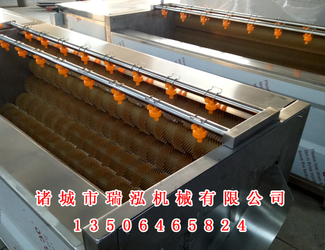 红薯清洗机的毛辊在电机的带动下通过相对逆向滚动,与产品直接接触产生摩擦达到去皮效果;并设有特制的自动高压喷淋喷头进行边去皮边冲洗,即可达到产品清洗并去皮的效果;并可根据产品品种更换毛刷棍毛的硬度,选用丝质较硬的毛刷辊,可以达到根茎类果蔬去皮效果,选用丝质较软的毛刷辊,可达到给果蔬上腊抛光的作用。并要注意的是,工作时要先开机运行后再投料,这样可以延长电机寿命,减少电机损坏的机率。