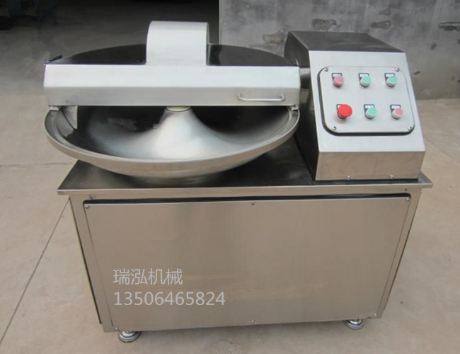 斩拌机由斩锅、刀轴、机架及电控系统组成。斩锅由电机通过减速机低速旋转,不断向刀组送料。刀轴由双速电机(或变频电机)经皮带带动高速旋转。原料在斩锅中作螺旋式运动的同时,被刀组搅拌和切碎并排除肉糜中的空气,由于切刀的高速斩切,减少了产品的液汁分离率,保证了乳化效果,增强了产品的弹性和细腻度。
