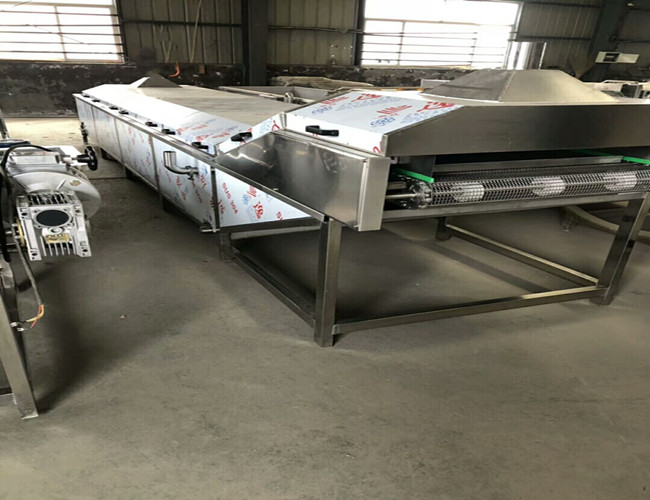 该流水线有蒸煮机,冷却机、沥水机等组成。整机采用SUS304不锈钢制作,漂烫温度、速度可根据工艺要求设定。该机运行平稳,噪音低,伸缩性小,不易变形,易保养。水温由温控仪自动控制,速度采用变频调速。主要适用于根茎类、脱水蔬菜、海带丝、鱿鱼等产品的漂烫。